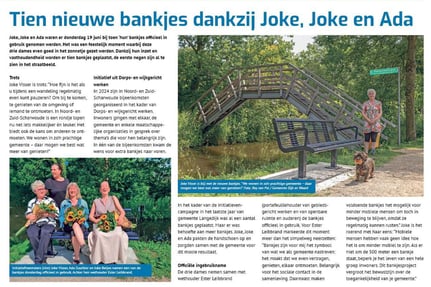 In het kader van het Dorps- en Wijkgericht Werken dat door de gemeente was gestart kwam er vanuit de inwoners de grote behoefte aan meer zitbankjes en met name Joke Visser (Senioren Dijk en Waard) heeft zich daar, samen met Joke Betjes en Ada Zuurbier, sterk voor gemaakt. Er waren al eerder bankjes geplaatst, maar er zijn er nu dus weer tien bijgekomen zodat er zeker zo'n twintig staan. Maar, volgens de initiatiefnemers kunnen er nog veel meer bijkomen want die voorzien echt in een behoefte. Zeker voor inwoners die wat slecht ter been zijn of gewoon ouder worden is het heel fijn om tijdens het wandelingetje soms even te kunnen uitrusten. "En dat is iets, waar anderen die makkelijk lopen gewoon niet bij stil staan", aldus Joke Visser.