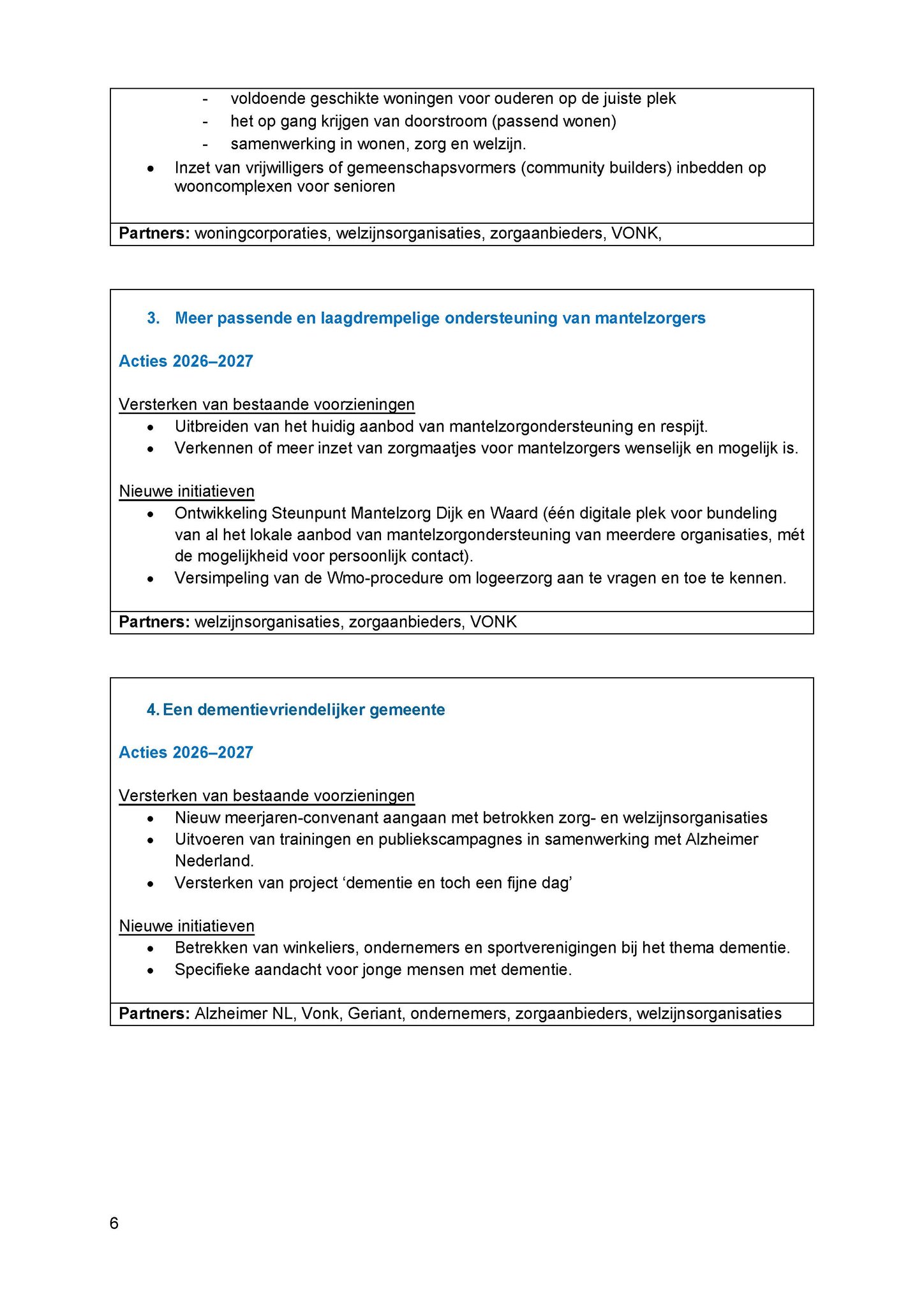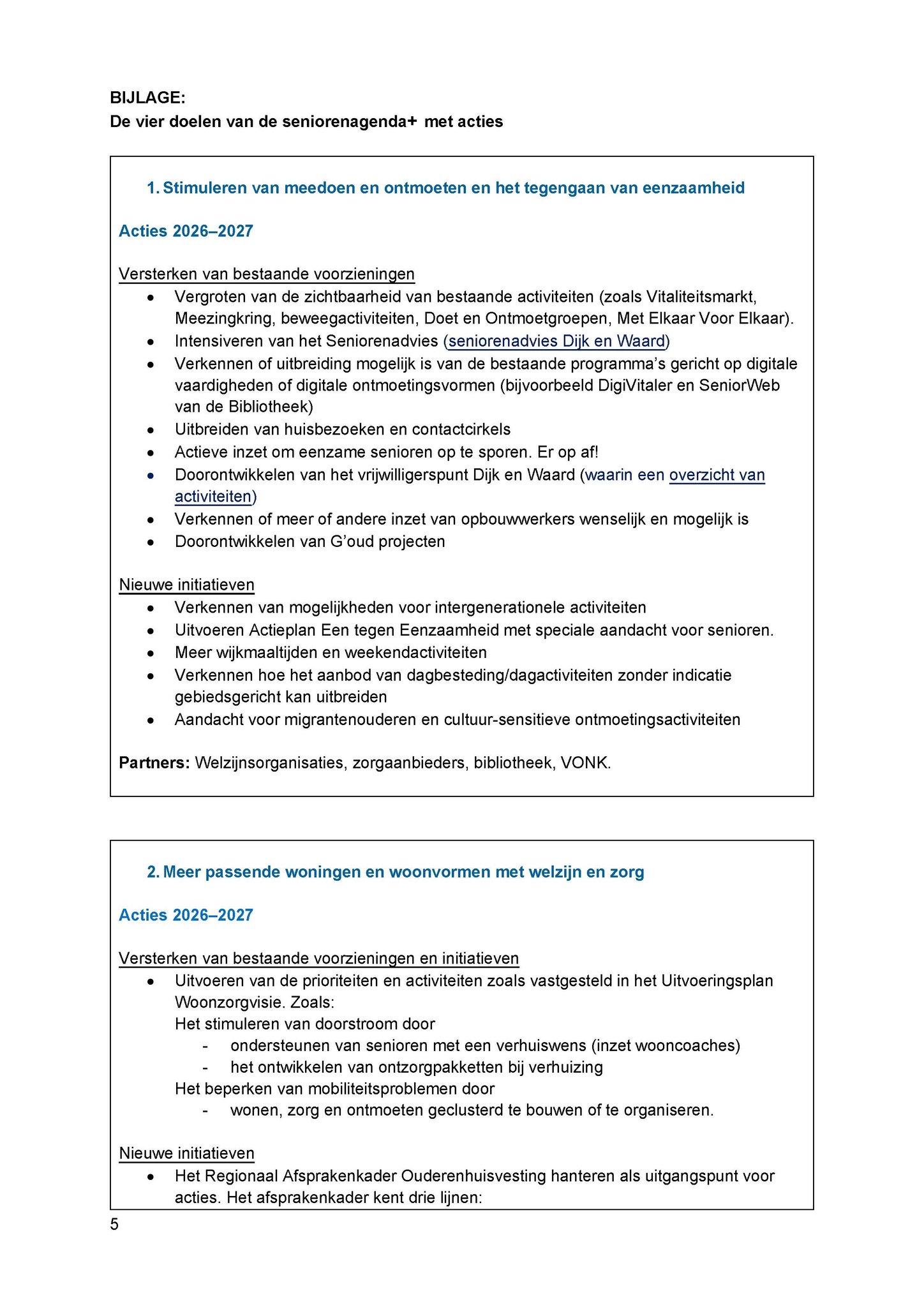 Door initiatieven te bundelen ontstaat samenhang, worden knelpunten zichtbaar en kan gericht worden bijgestuurd. De agenda fungeert zo als een kompas voor een vitaal, leefbaar en sociaal Dijk en Waard voor senioren.