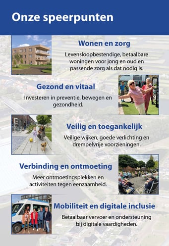 “Onze kernen dienen hun eigen identiteit te behouden en volwaardig mee te doen in de groei van onze gemeente. Daar woon je graag en daar wil je blijven wonen! Dat vraagt dus om meer ouderenhuisvesting in wijk, buurt of dorp.”